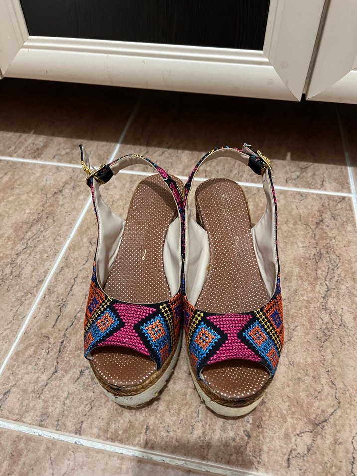 Renkli yılan desenli, tokalı kayışlı dolgu topuklu sandalet. Bohem tarzda, günlük kullanım için uygundur. Kauçuk malzemeden üretilmiştir.