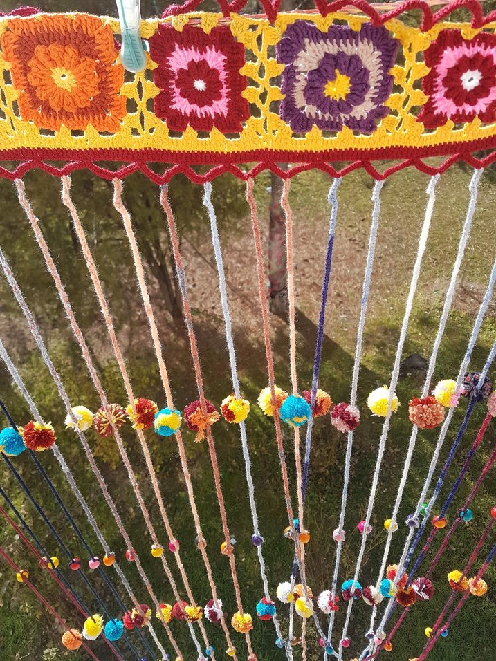 Renkli ponponlarla süslenmiş çoklu iplerden oluşan bohem tarzda el yapımı duvar süsü. köy evinize,yazlığında,çocuk odanıza çok yakışacak hatta arkadaşınıza hediye için harika bir ürün