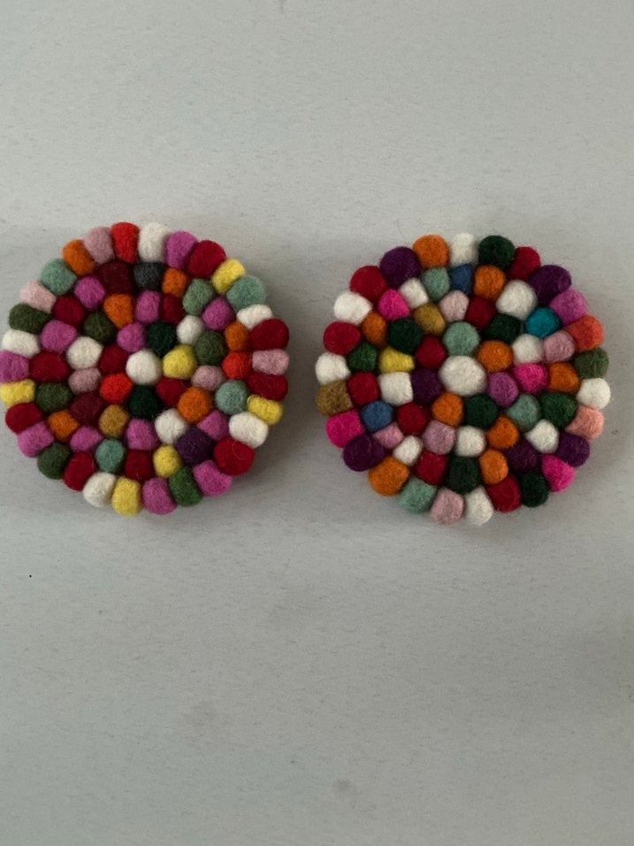 Yuvarlak şekilli, yumuşak keçe toplardan yapılmış renkli bohem tarzı el yapımı bardak altlıkları. Masanıza canlılık katmak için idealdir. 10 cm çap