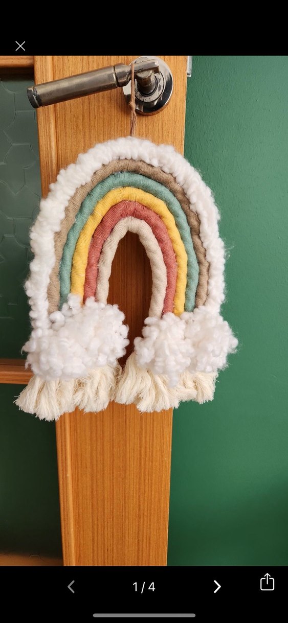 Yumuşak pamuk dokulu, pastel renklerde el yapımı bohem makrome gökkuşağı, duvar süsü olarak kullanılabilir.