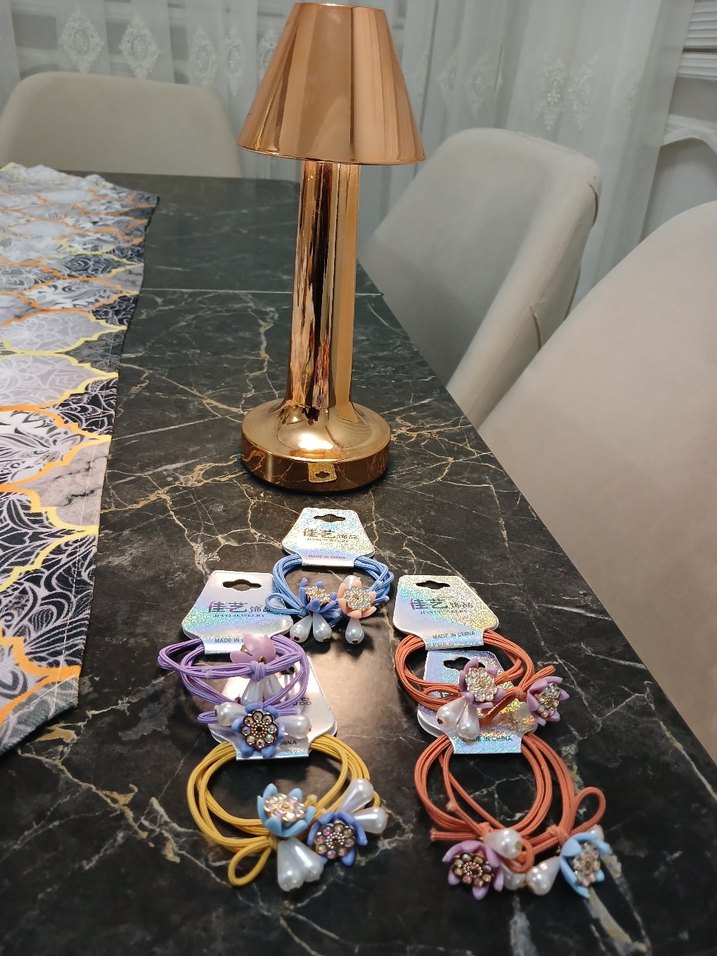 Renkli, elastik çocuk saç tokaları, bohem tarzda baskılı ve boncuklu detaylarla. Retro ve hippie görünüm için uygun.