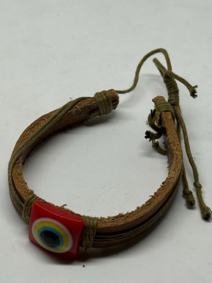 Çok katmanlı deri bant ve renkli göz şeklinde boncuk içeren renkli bohem erkek bileklik. Kordonla ayarlanabilir.