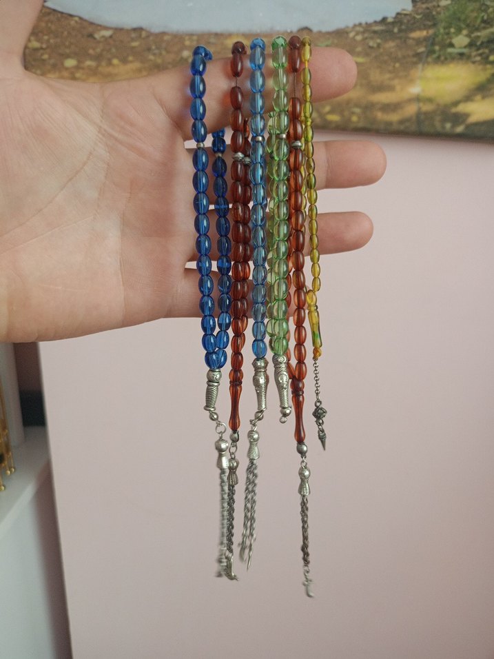 Çeşitli canlı renklerde ve metal püsküllü, bohem tarzda renkli erkek tesbih seti. Koleksiyon veya kullanım için uygun.