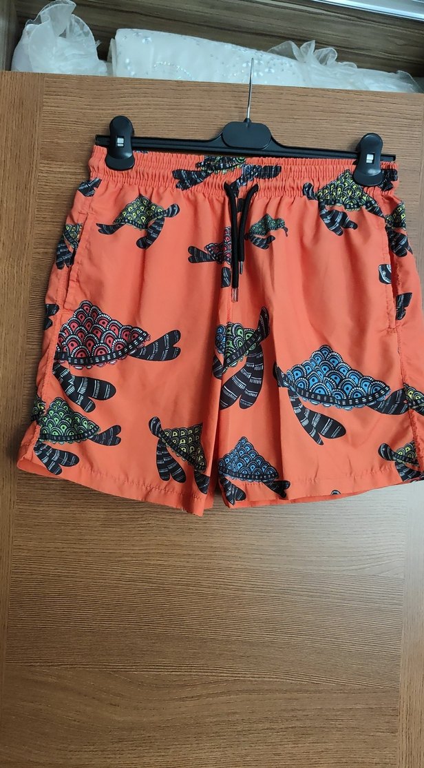 Renkli kaplumbağa desenli, bol kesim erkek mini yüzme şortu. Plaj ve sokak stiline uygun, S beden