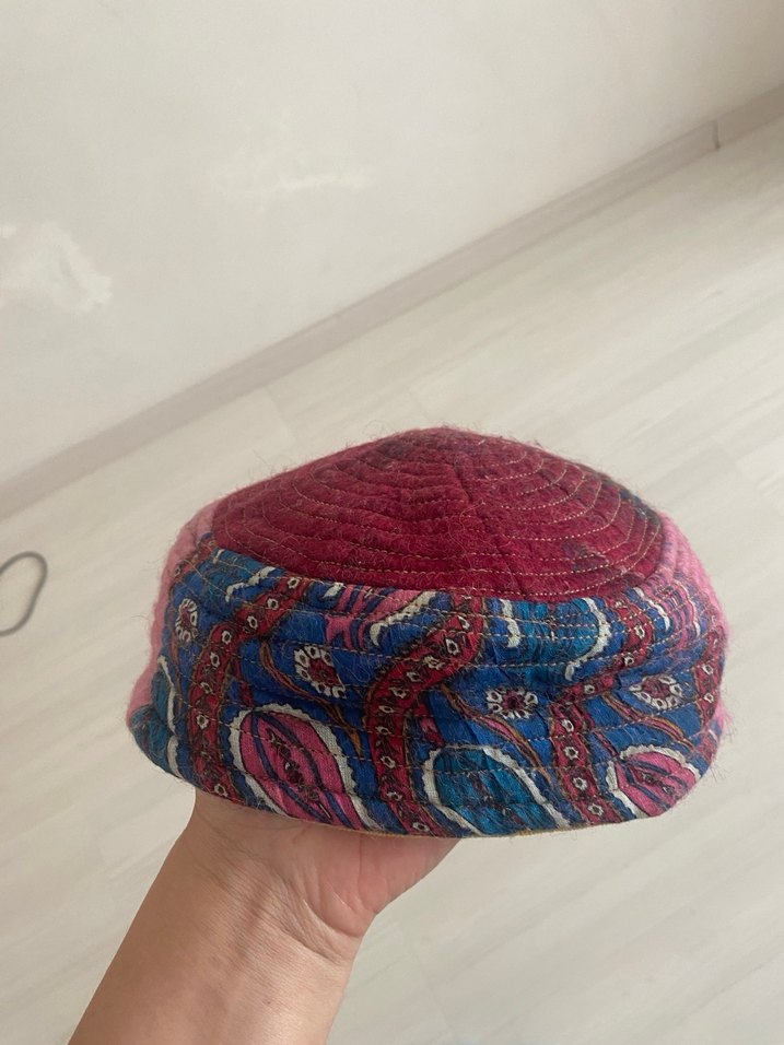 Renkli kırmızı, mavi ve mor desenlere sahip bohem erkek şapka, retro ve hippie tarzına uygun.