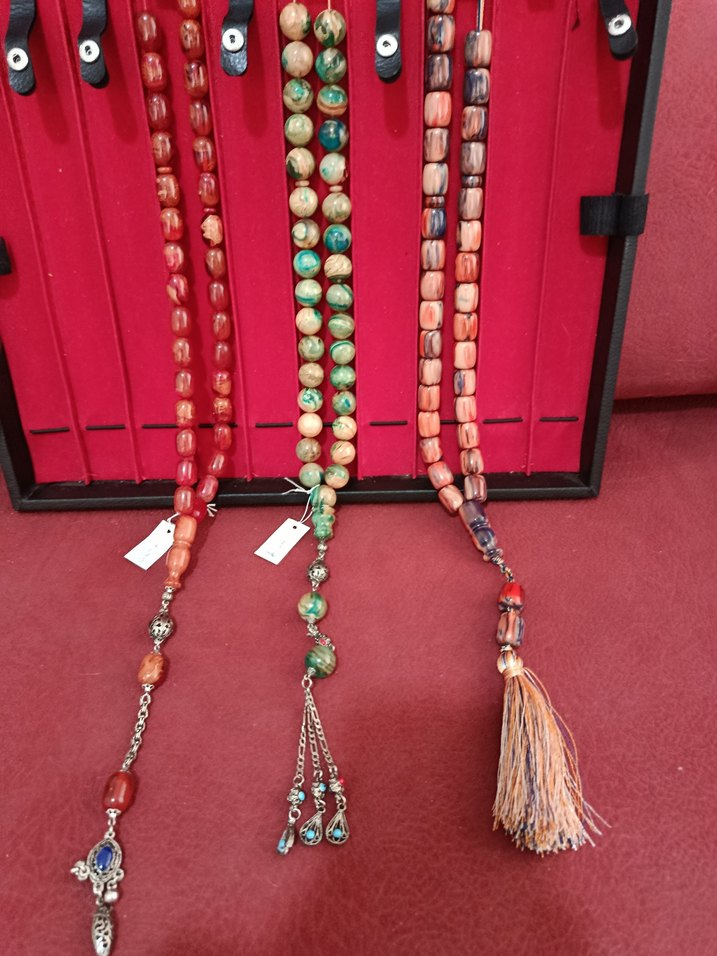 Lütfen fiyat sorunuz...Çeşitli boncuk şekilleri ve püsküllerle renkli bohem tarzda erkek tespihleri, her biri farklı dekoratif detaylara sahip.