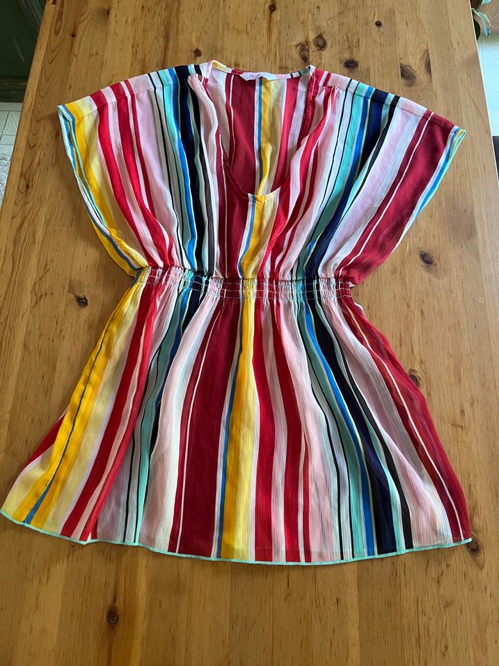 Renkli bohem bol kesim, pileli detaylı ve kayık yaka. Kolsuz ve midi boyda, plaj için uygun. Canlı renkli çizgili desen sentetik kumaşta.