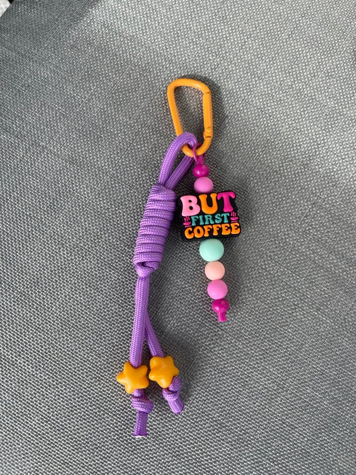 Esnek mor ip, sarı yıldız boncuklar ve 'But First Coffee' yazılı figürlü renkli bohem kadın anahtarlığı. ☕