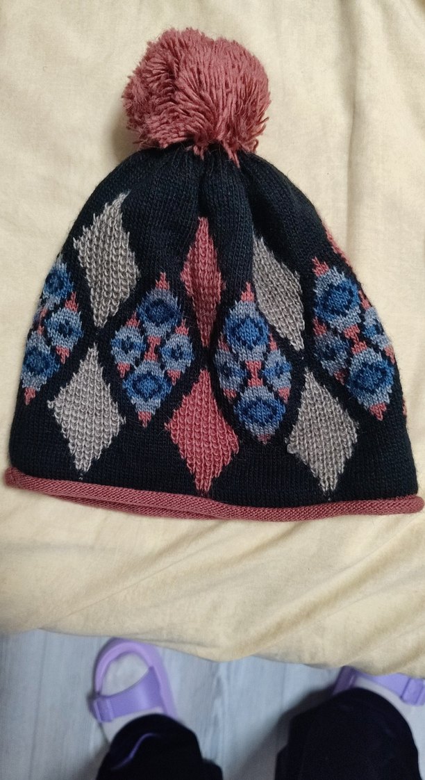 Üstünde ponpon bulunan, koyu renkli çok renkli desenlere sahip örgü kadın bere, rahat bohem tarzını yansıtıyor.