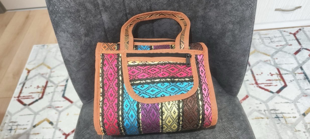 Renkli bohem tarzda, fermuarlı cepleri olan bağlama desenli kadın çantası. Sentetik kumaştan üretilmiş, günlük kullanıma uygun retro ve hippie tarzda.