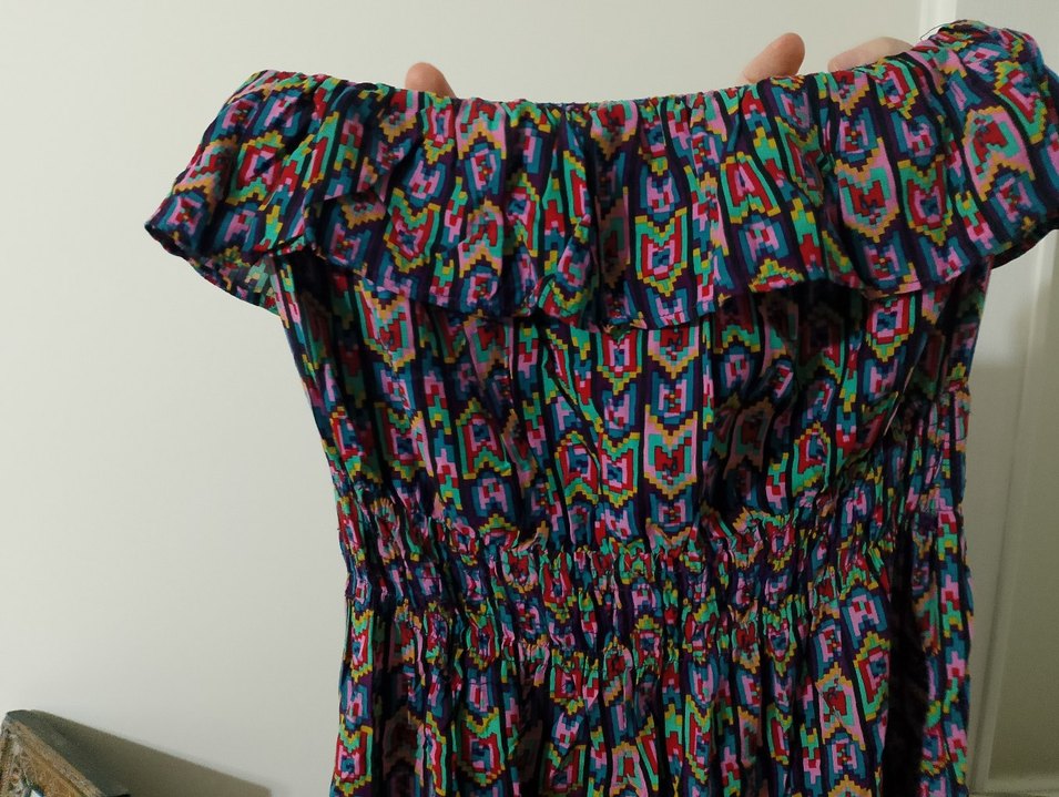 Renkli, bohem tarzda, tek parça elbise Kayık yaka rahatkullanım sunar. Sentetik yumuşak kumaştan, desenli ve fırfırlı detaylıdır.