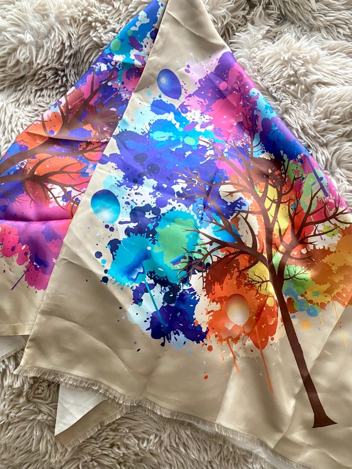 Renkli baskılar ve zincir detaylarıyla bohem tarzda, retro ve hippie etkileri taşıyan kadın eşarp