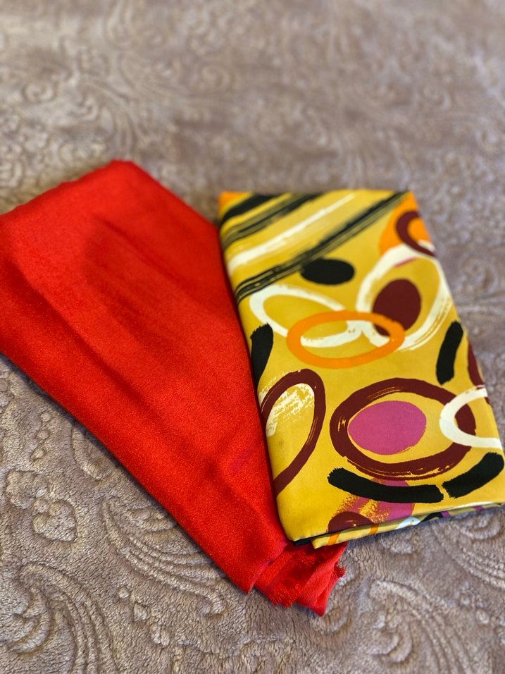Yumuşak sentetik kumaştan, rahat bohem stile uygun renkli ve drapeli kadın eşarbıCanlı kırmızı ve desenli sarı seçenekler.