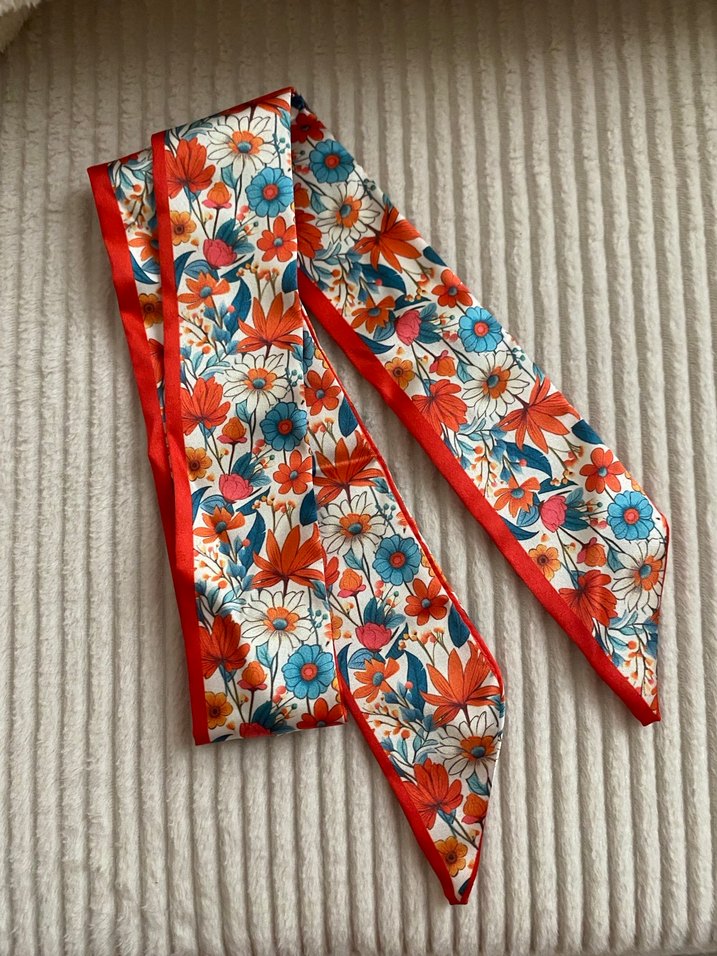 Kadınlar için çok renkli çiçek desenli, kurdele kenarlı, yumuşak sentetik kumaştan bohem tarzda fular. Hiç kullanılmadı