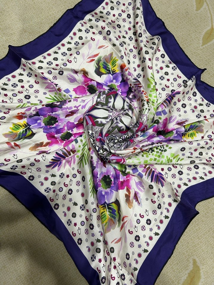 Renkli, dökümlü yapıya sahip bohem tarzda kadın fular. Canlı çiçek ve soyut desenlerle yumuşak sentetik kumaştan.
