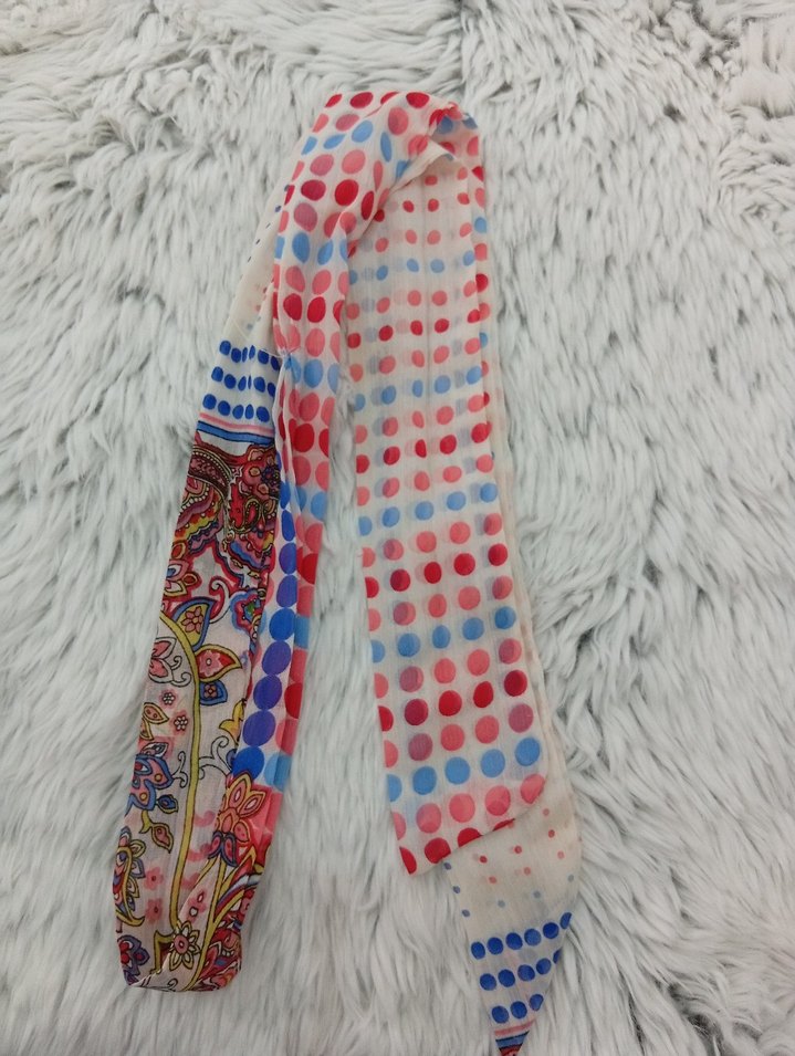 Renkli puantiye ve paisley desenli, kurdele detaylı, yumuşak sentetik kumaştan bohem kadın fular.