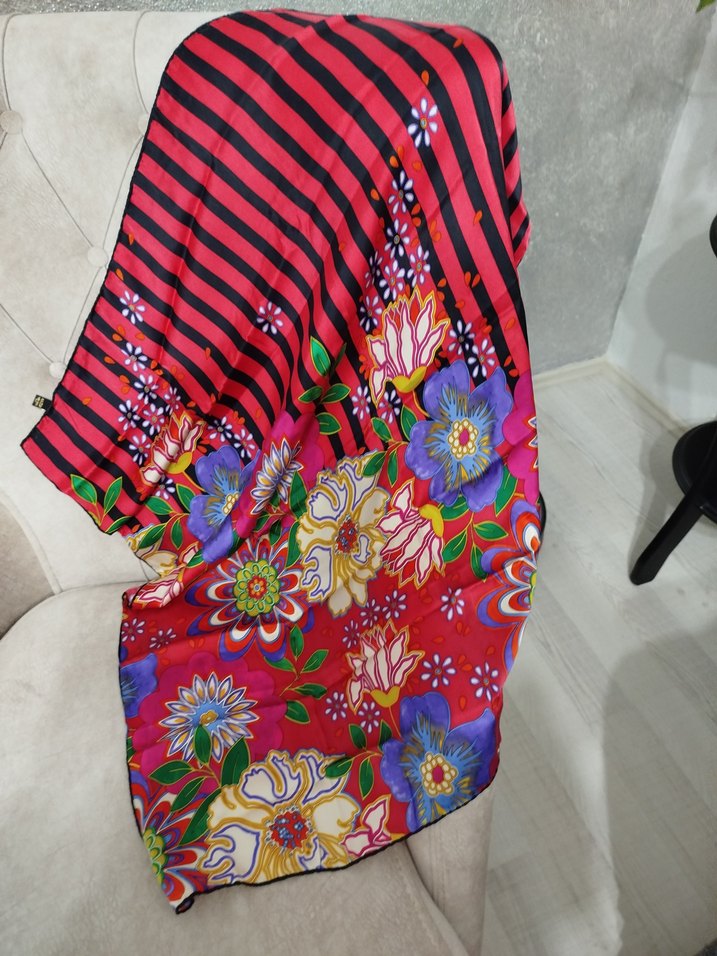 Renkli ve canlı çiçek desenlerine sahip, ipek dokulu kadın eşarp