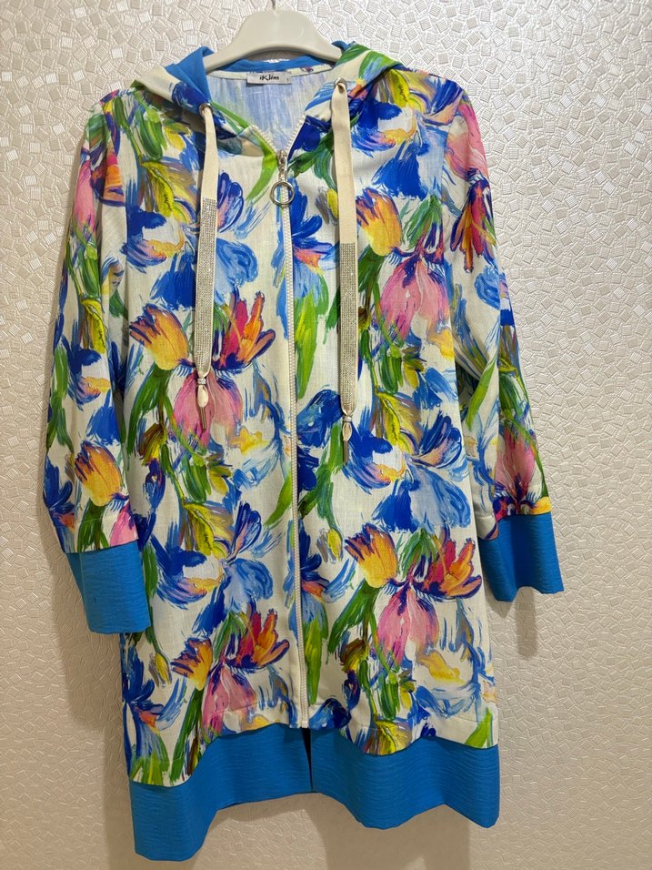 Kadınlar için renkli tie-dye desenli kapüşonlu, uzun kollu, fermuarlı, kısa ve bol kesim mini yağmurluk.
