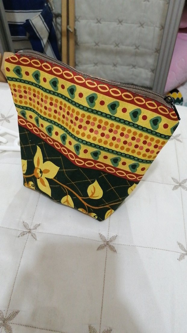 Renkli, bohem tarzda desenli sentetik kumaştan kadın makyaj çantası, fermuarlı. Günlük kullanım için uygundur.