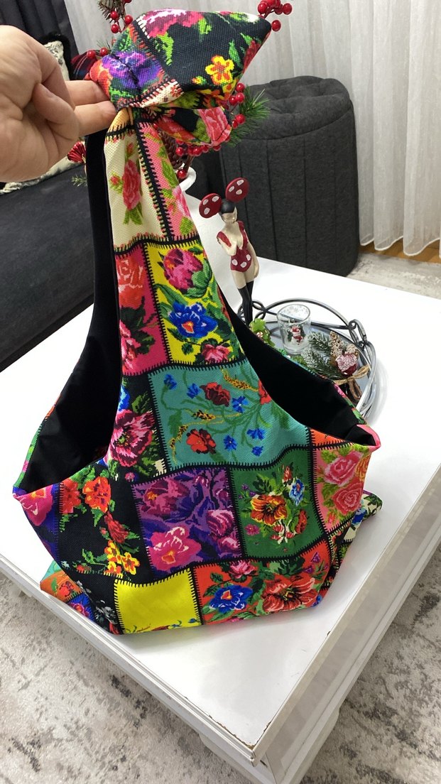 Sentetik kumaştan, fermuarlı, renkli bohem tarzda kadın omuz çantası. Günlük kullanım için uygun.