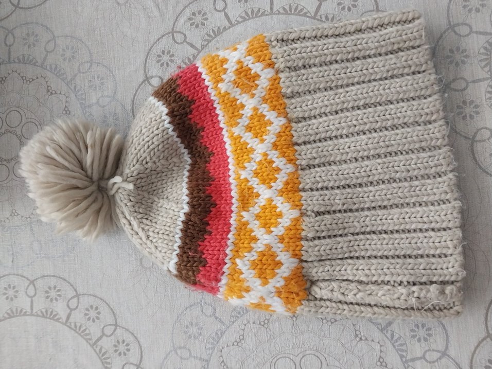 Kadınlar için çok renkli, örgü ve bohem tarzda, rahat ve retro görünümlü bere. Gri, sarı, beyaz, kırmızı ve kahverengi renkler içerir.
