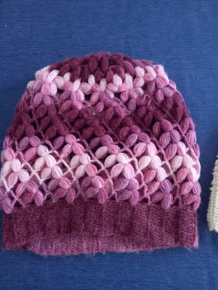 Renkli, mor tonlarında örgüden yapılmış kadın bere. Bohem ve retro tarzını yansıtan rahat ve şık bir model.