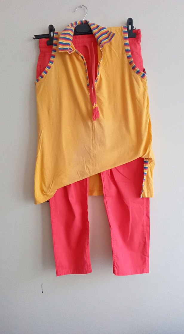 Renkli bohem tarzda, püskül detaylı ve batik desenli bol kesim kız pantolonu. Yumuşak sentetik kumaştan üretilmiştir. tişört en 50 boy65 pantolon bel çevresi 92 boy 70