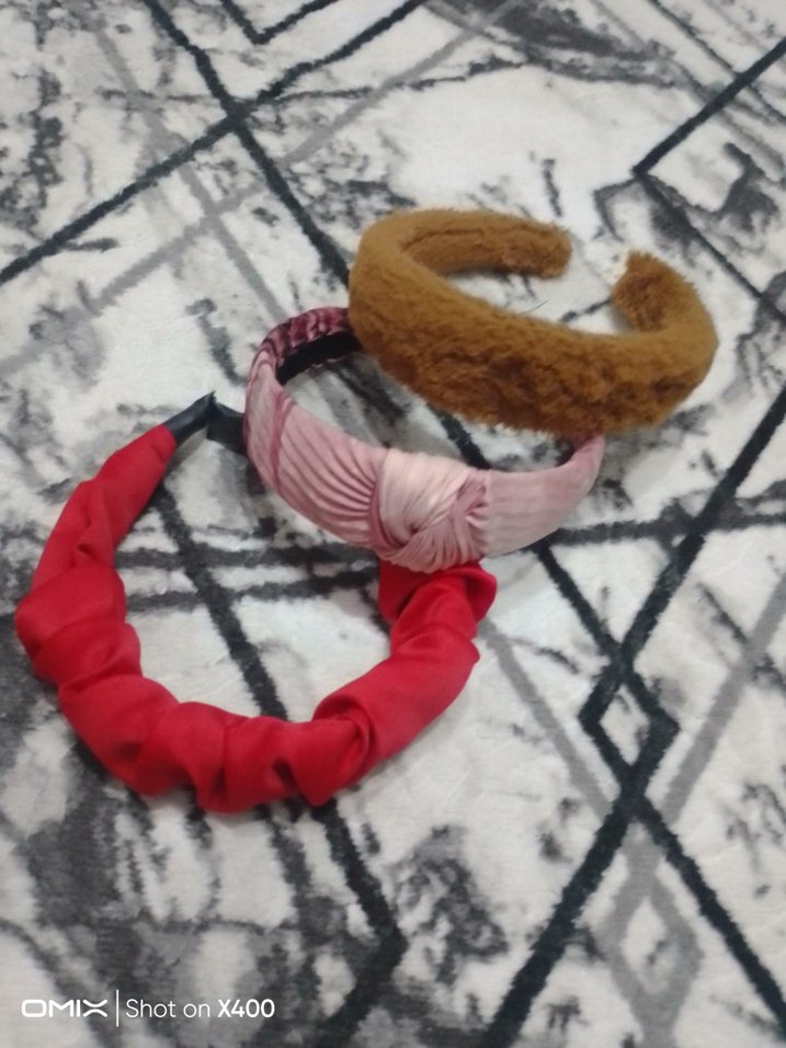 Yumuşak sentetik kumaştan yapılmış, elastik bantlı üç renkli bohem kadın saç aksesuarı seti.