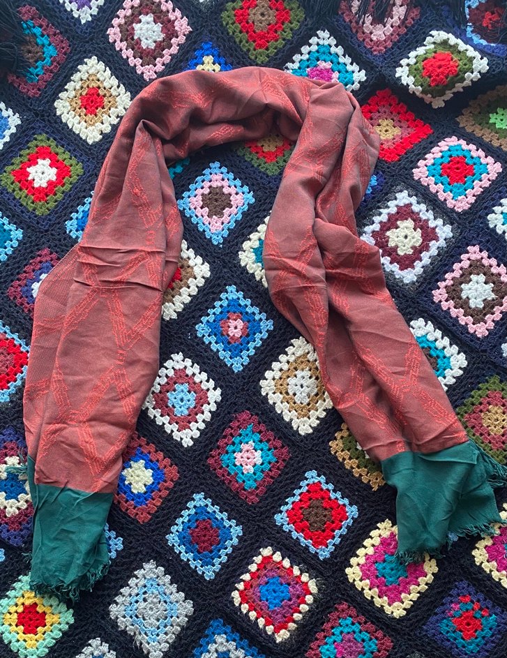 Yumuşak kumaştan, renkli ve bohem tarzda, drapeli kadın şalı.