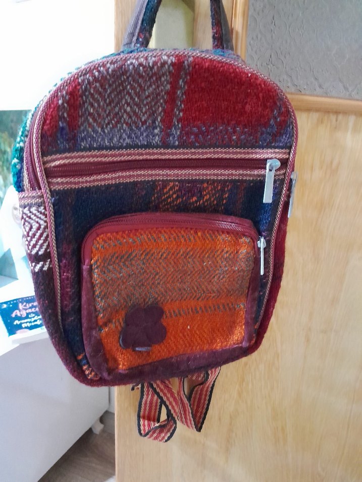 Renkli kumaştan yapılmış, tie-dye desenli ve fermuarlı ceplere sahip bohem tarzda kadın sırt çantası.