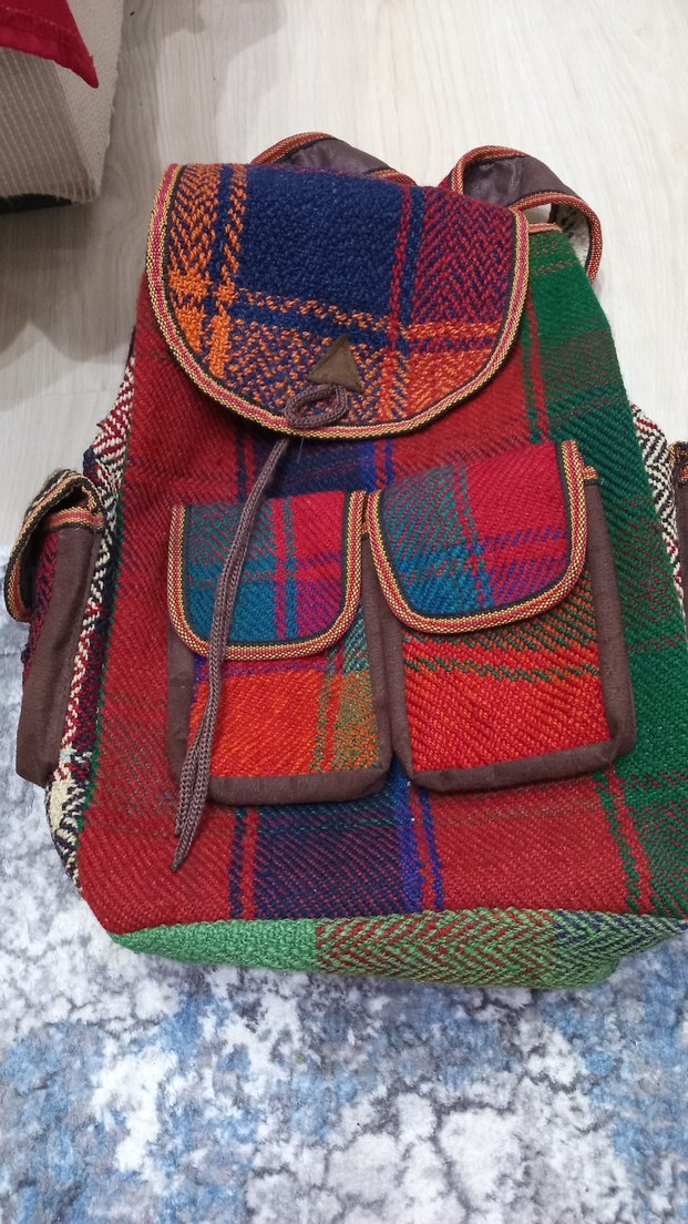 Sentetik kumaştan, renkli desenli ve tokalı ceplere sahip, günlük kullanıma uygun bohem tarzda kadın sırt çantası.