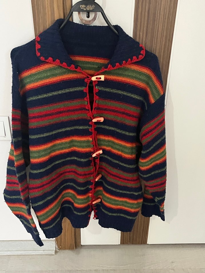 Bohem tarzı kadın triko hırka, bol kesim ve uzun kolludur. Örgü kumaştan, bisiklet yaka ve çok renkli koyu çizgilerle günlük kullanıma uygundur.