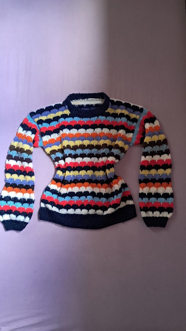 Renkli, örgü dokulu, yuvarlak yaka ve uzun kollu kadın triko kazak. Rahat kesimi ve bohem tarzıyla günlük kullanım için uygundur. üstünde ufak bir leke vardır çıkar