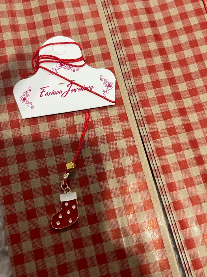 Renkli bohem tarzda, kırmızı kurdele ve baskılı, süslemeli çorap figürlü kolye.