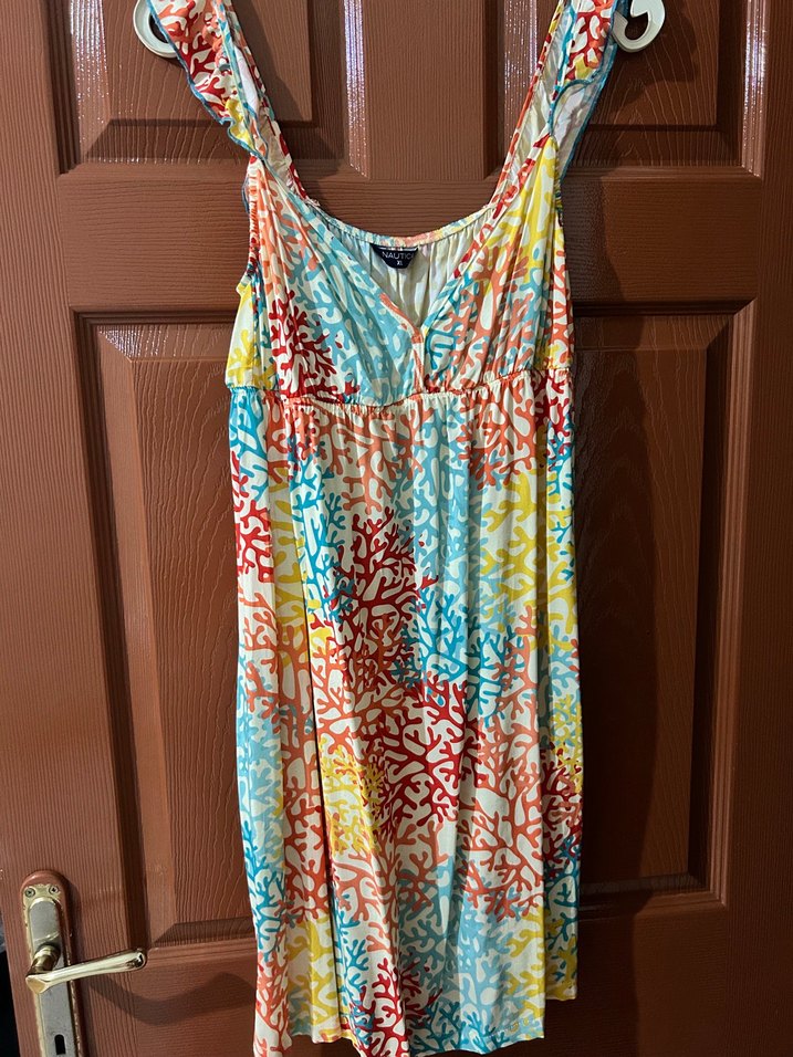 Renkli bağlamalı, askılı kısa elbise. Rahat kesim ve yumuşak tekstil kumaştan, bohem tarzı için uygun. Plaj için uygundur