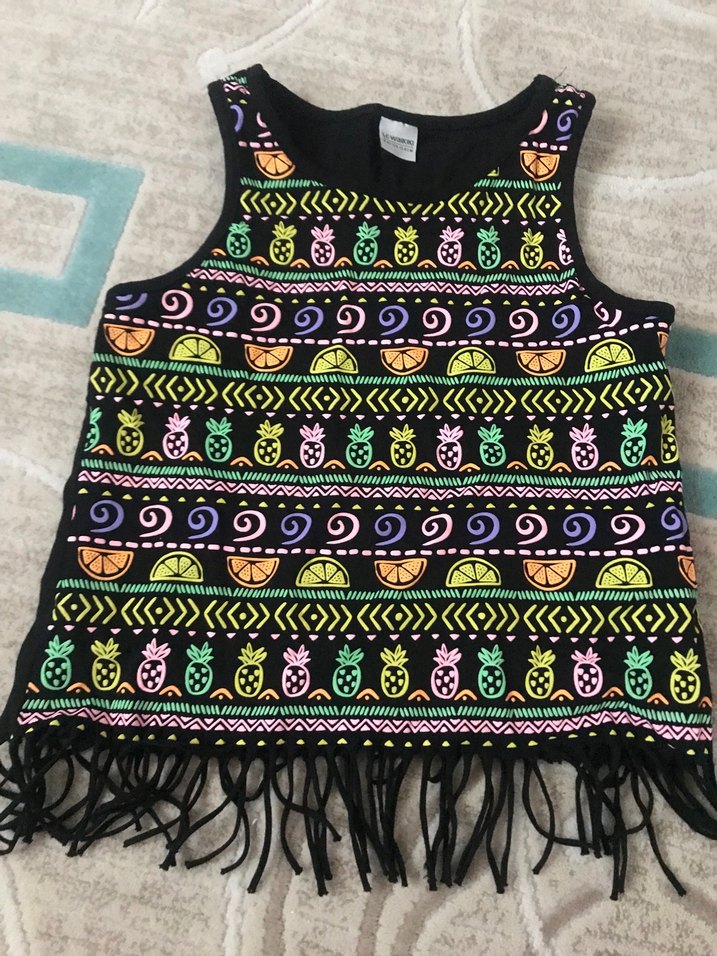 Renkli bağlama desenli, örme kumaştan, bohem tarzı yumuşak dokulu kız çocuk atlet. Salaş kesim ve yuvarlak yaka.