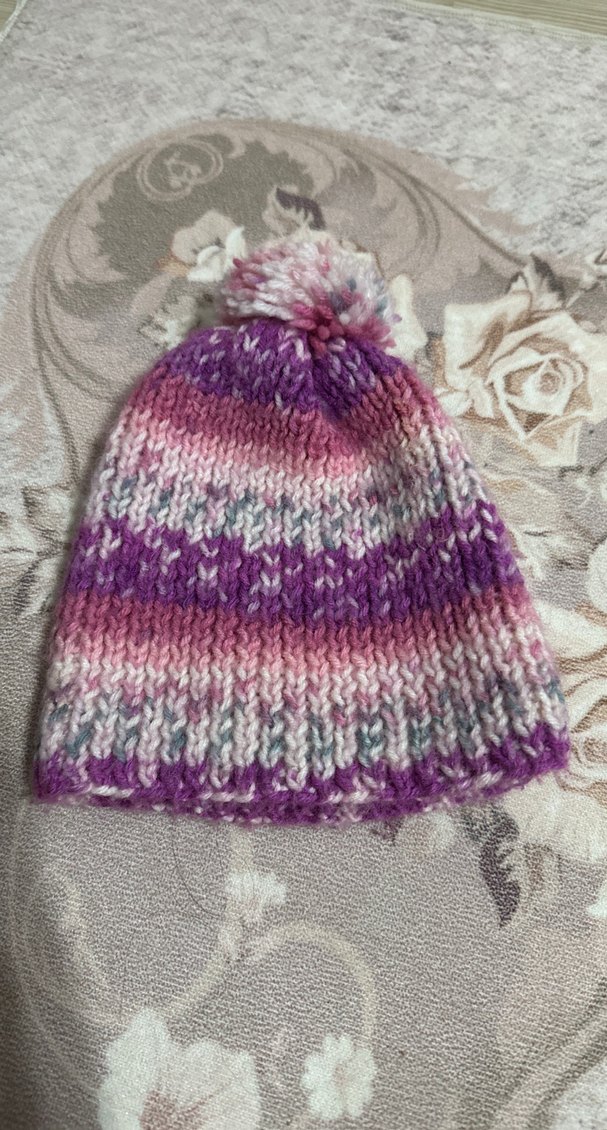 Renkli örgü ve ponpon detaylı kız çocuk bere. Canlı pembe, mor ve gri tonlarıyla bohem ve retro tarzını yansıtır. Sıcak ve rahat bir görünüm sunar.