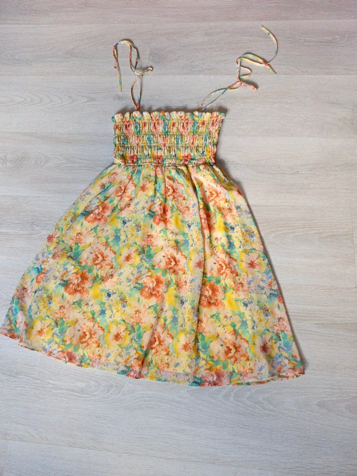 Renkli bohem kız elbisesi, askısız yakalı, fırfırlı ve ayarlanabilir ince askılıdır. Yumuşak sentetik kumaştan, bol kesim ve batik desenlidir.