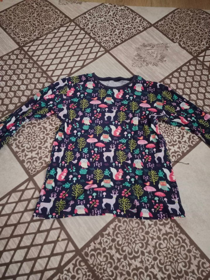 Renkli, uzun kollu, bol kesim kız tişörtü. Yumuşak sentetik kumaştan, örme dokulu ve bohem desenli, yuvarlak yakalıdır.