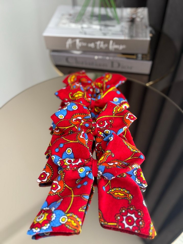 Canlı renklerde bohem desenli kumaştan yapılmış fiyonk şeklinde saç aksesuarı, retro ve karşı kültür tarzına uygundur.