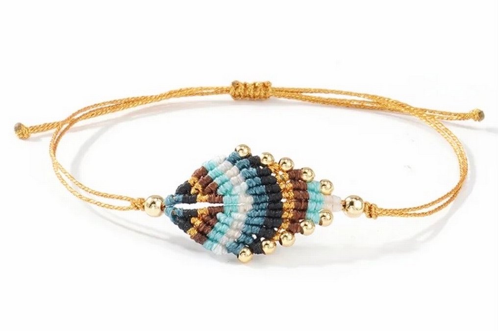 Bu renkli bohem bileklik, etnik desenli boncuklar ve altın detaylar içerir. Ayarlanabilir ipiyle günlük kullanıma uygundur.