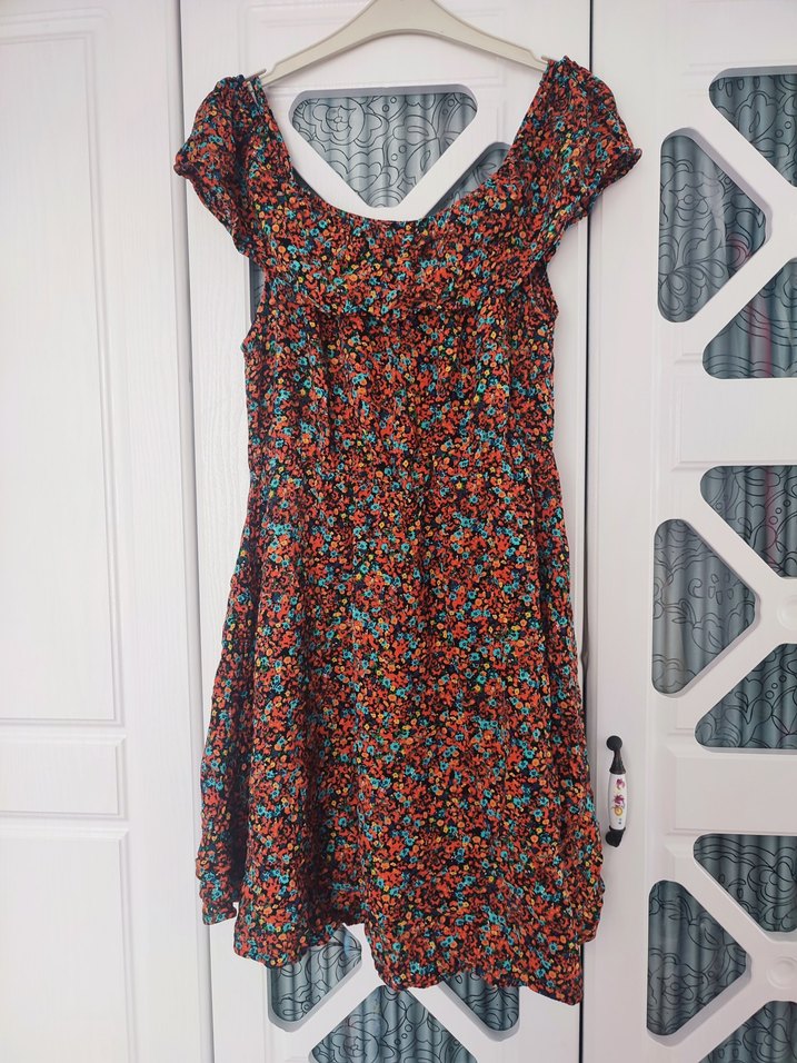Kadınlar için kısa kollu, bol kesim midi elbise. Renkli batik desenli, fırfır detaylı, sentetik kumaştan, bohem tarzında.