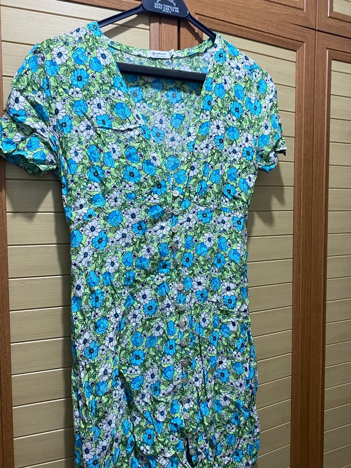 Pamuk kumaştan, kısa kollu, düğmeli ve V yakalı bohem tarzı renkli midi elbise. Çiçek desenleriyle dikkat çeker.