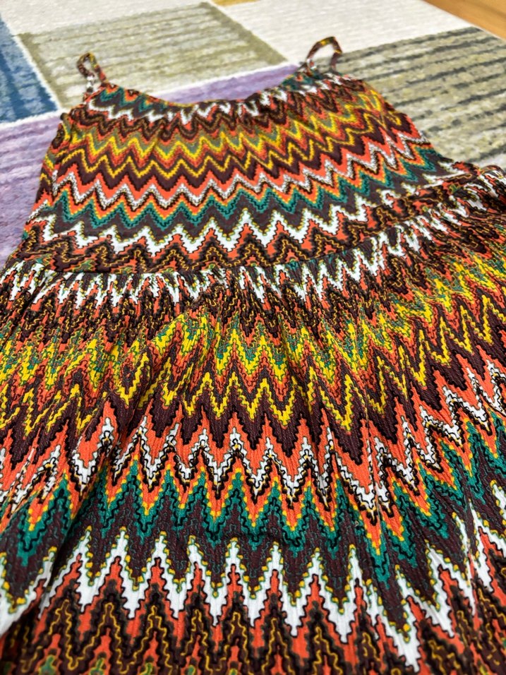 Renkli örgü elbise, ince askılı ve kayık yaka detaylarıyla bohem tarzını yansıtıyor. Uzun ve vücuda oturan kesimiyle günlük kullanıma uygun.