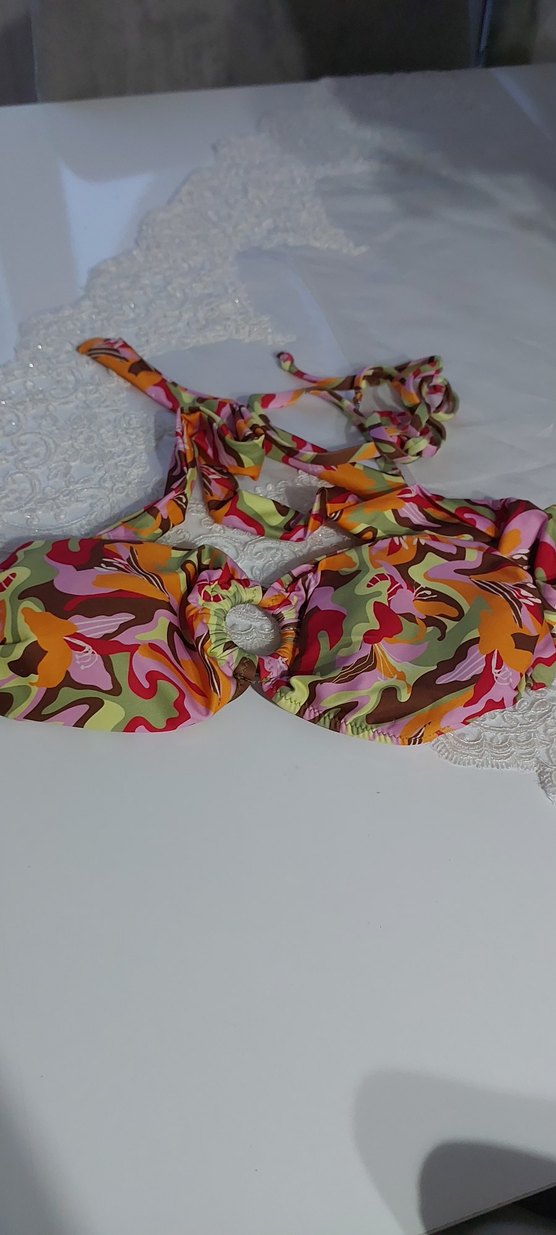 Renkli tie-dye desenli, askılı ve fırfırlı detaylı, bol kesim mini bikini üstü, açık hava kullanımı için uygundur.
