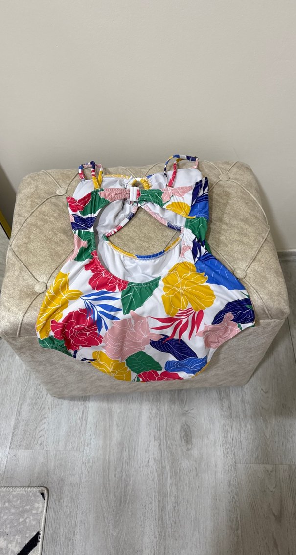 Renkli baskılı desene sahip, askılı ve volan detaylı bohem tarzı mini mayo, rahat kesim ve plaj için uygundur.