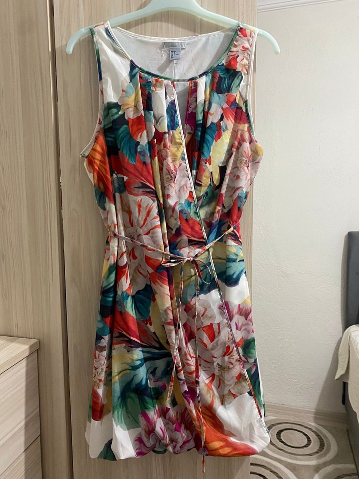 Renkli çiçek desenli, drapeli kolsuz mini elbise. Sentetik kumaştan, straplez yakalı ve bol kesimdir. Günlük kullanım için uygundur.