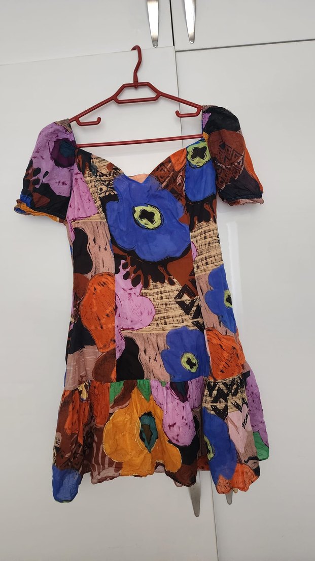 Kalp yaka, balon kol, bol kesim ve canlı renkli batik desenli bu bohem mini elbise, fırfır detaylarıyla günlük kullanım için uygun.