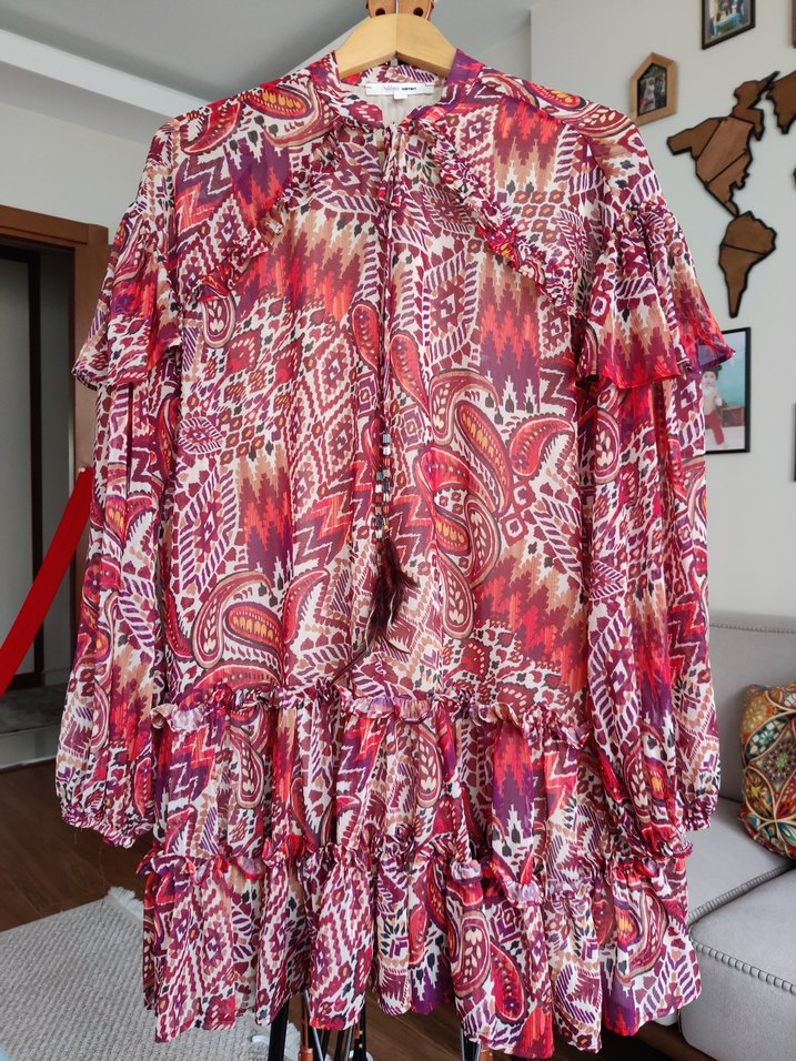 Renkli, bohem tarzda, uzun kollu ve fırfırlı detaylı mini elbise . tunik olarak da kullanılabilir. Bol kesim ve canlı etnik desenlidir. koton Aslıhan Malbora koleksiyonundan. sadece 2 kere giyildi hiçbir defosu yoktur. astarlıdır
