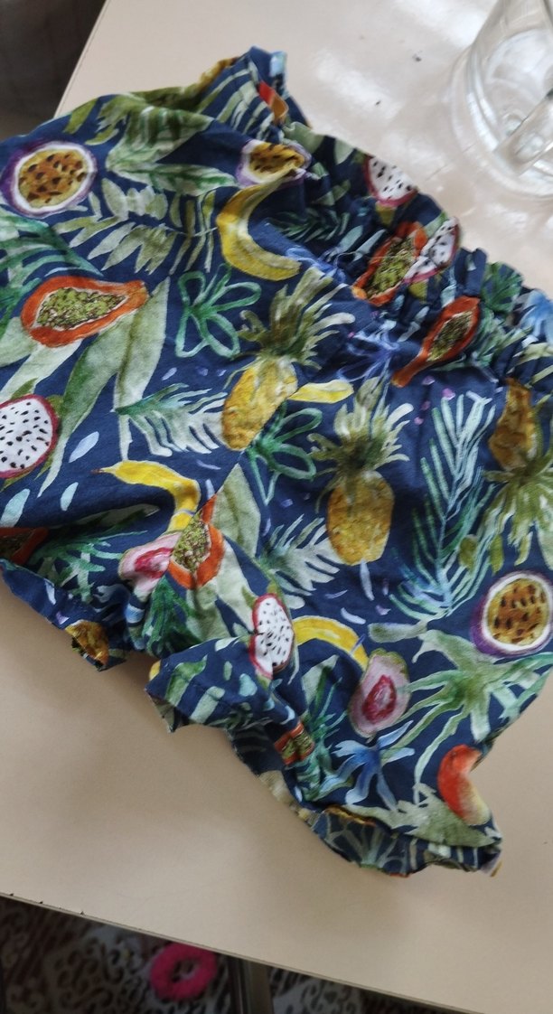 Renkli tie-dye desenli, fırfırlı, bol kesim mini hamile şortu, yumuşak sentetik kumaştan. Günlük kullanım için bohem tarzda.